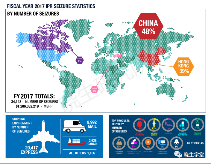 2018年4月,根據(jù)美國USTR(貿(mào)易代表處)發(fā)布2017年度特別301報告——《關(guān)于知識產(chǎn)權(quán)保護和盜版和假冒市場審查報告》,以及美國海關(guān)和邊境保護局(CBP)發(fā)布的《2017年財年美國海關(guān)知識產(chǎn)權(quán)侵權(quán)商品統(tǒng)計報告》,中國繼續(xù)位居美國海關(guān)知識產(chǎn)權(quán)侵權(quán)商品扣押商品來源國榜首。