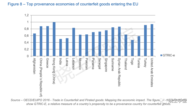 同美國一樣,歐盟于2018年發(fā)布的《SYNTHESIS REPORT ON IPR INFRINGEMENT 2018》指出,中國仍然是假冒商品來源的關(guān)鍵國家,而香港則是一個原產(chǎn)于中國的貨物的中轉(zhuǎn)站,同時從數(shù)據(jù)中看到連續(xù)三年中國和香港位居假冒產(chǎn)品來源地榜首。
