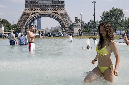 (法國(guó)發(fā)布橙色高溫預(yù)警,當(dāng)?shù)鼐用窈陀慰驮诎7茽栬F塔下玩水)